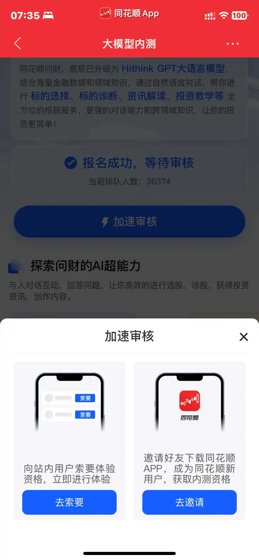 同花顺 大模型内测 加速审核弹窗_2024 01 13