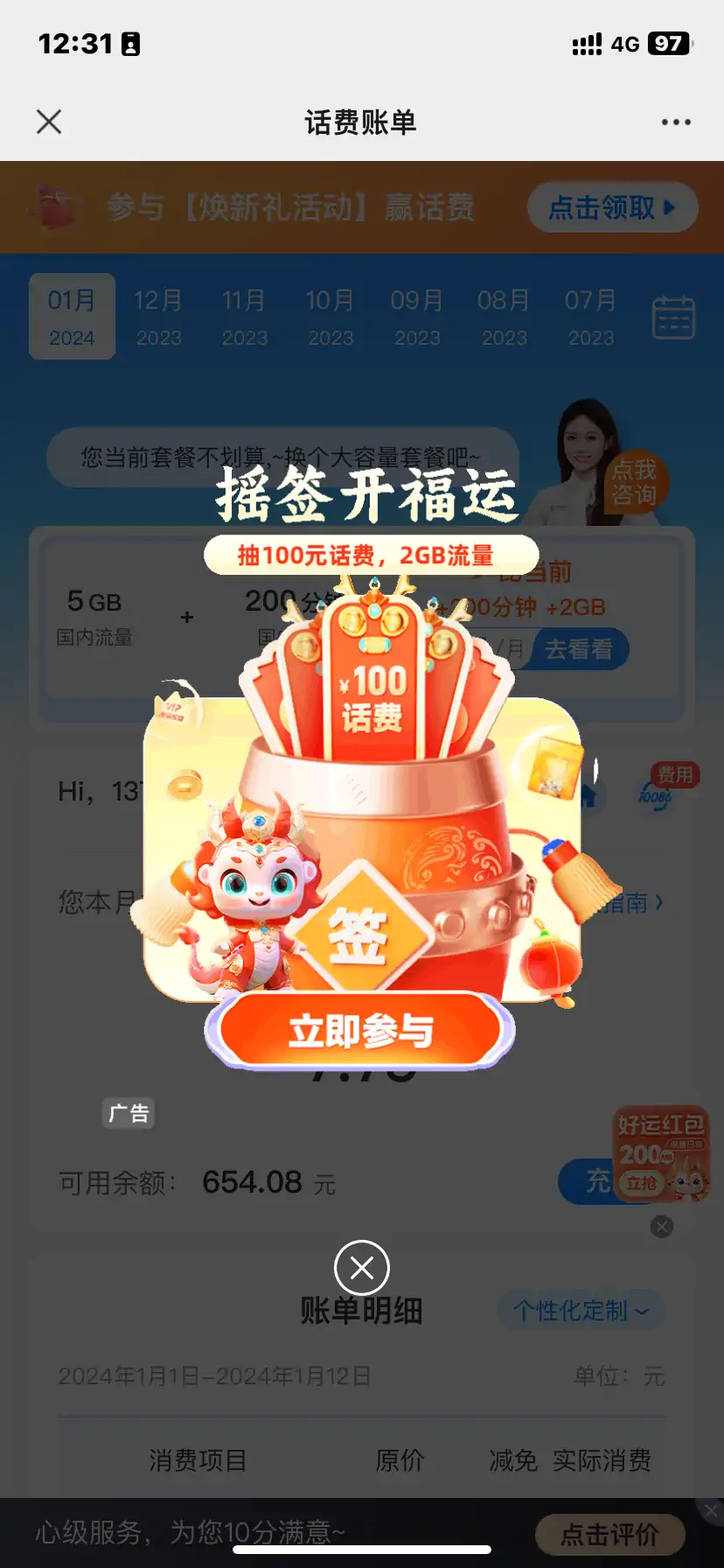 中国移动 公众号 查话费 龙年 活动弹窗_2024 01 13